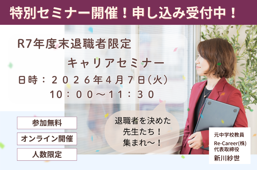◉R7年度末退職者限定キャリアセミナー 開催決定!◉ 今年度も残り3ヶ月を切り、学校では1年のまとめの時期、そして次年度に向けての計画が大詰めを迎える時期になりました。昨年の秋口〜年末は、次年度の身の置き方について(続け […]